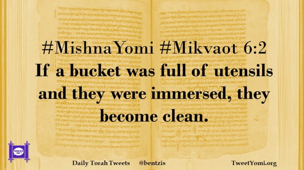 Mikvaot, MishnaYomi #MishnaYomi #Mikvaot 6:2 Date: August 25, 2021Author: ysspitz #MishnaYomi #Mikvaot 6:2 If a bucket was full of utensils and they were immersed, they become clean. Share this: Share on X (Opens in new window) X Share on Facebook (Opens in new window) Facebook Like Loading... Related