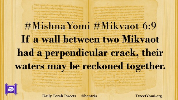 Mikvaot, MishnaYomi #MishnaYomi #Mikvaot 6:9 Date: August 25, 2021Author: ysspitz #MishnaYomi #Mikvaot 6:9 If a wall between two Mikvaot had a perpendicular crack, their waters may be reckoned together. Share this: Share on X (Opens in new window) X Share on Facebook (Opens in new window) Facebook Like Loading... Related