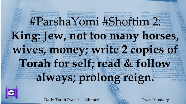 #ParshaYomi #Shoftim 2: King: Jew, not too many horses, wives, money; write 2 copies of Torah for self; read & follow always; prolong reign.