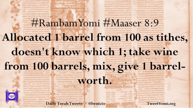 #RambamYomi #Maaser 8:9 Allocated 1 barrel from 100 as tithes, doesn’t know which 1; take wine from 100 barrels, mix, give 1 barrel-worth.
