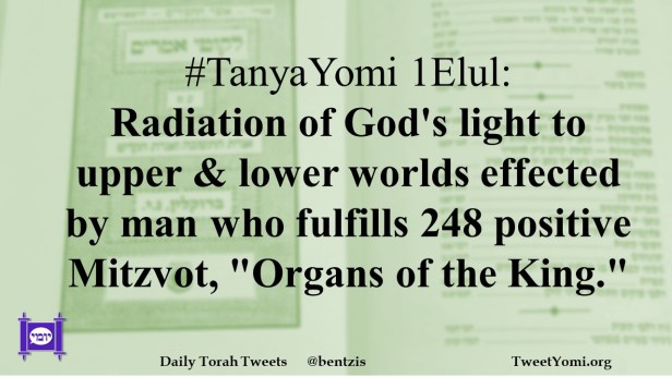 #TanyaYomi 1Elul: Radiation of God’s light to upper & lower worlds effected by man who fulfills 248 positive Mitzvot, “Organs of the King.”