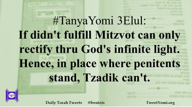 #TanyaYomi 3Elul: If didn’t fulfill Mitzvot can only rectify thru God’s infinite light. Hence, in place where penitents stand, Tzadik can’t.