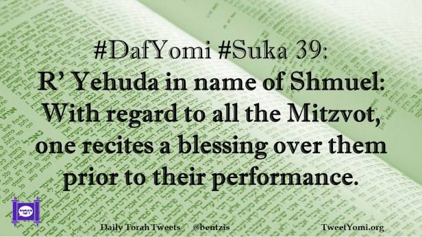 DafYomi, Suka #DafYomi #Suka 39 Date: August 26, 2021Author: ysspitz #DafYomi #Suka 39: R’ Yehuda in name of Shmuel: With regard to all the Mitzvot, one recites a blessing over them prior to their performance. Share this: Share on X (Opens in new window) X Share on Facebook (Opens in new window) Facebook Like Loading... Related