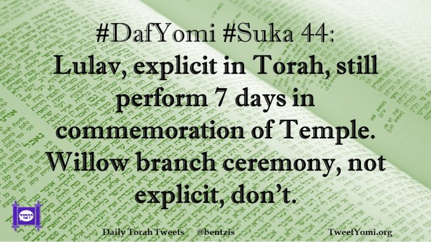 DafYomi, Suka #DafYomi #Suka 44 Date: August 27, 2021Author: ysspitz #DafYomi #Suka 44: Lulav, explicit in Torah, still perform 7 days in commemoration of Temple. Willow branch ceremony, not explicit, don’t. Share this: Share on X (Opens in new window) X Share on Facebook (Opens in new window) Facebook Like Loading... Related