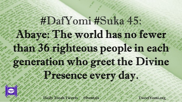 DafYomi, Suka #DafYomi #Suka 45 Date: August 27, 2021Author: ysspitz #DafYomi #Suka 45: Abaye: The world has no fewer than 36 righteous people in each generation who greet the Divine Presence every day. Share this: Share on X (Opens in new window) X Share on Facebook (Opens in new window) Facebook Like Loading... Related