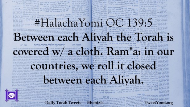 #HalachaYomi OC 139:5 Between each Aliyah the Torah is covered w/ a cloth. Ram”a: in our countries, we roll it closed between each Aliyah.