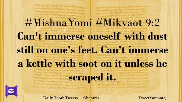 #MishnaYomi #Mikvaot 9:2 Can’t immerse oneself with dust still on one’s feet. Can’t immerse a kettle with soot on it unless he scraped it.
