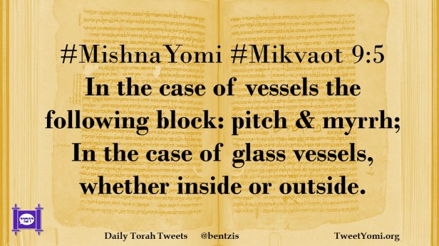 #MishnaYomi #Mikvaot 9:5 In the case of vessels the following block: pitch & myrrh; In the case of glass vessels, whether inside or outside.