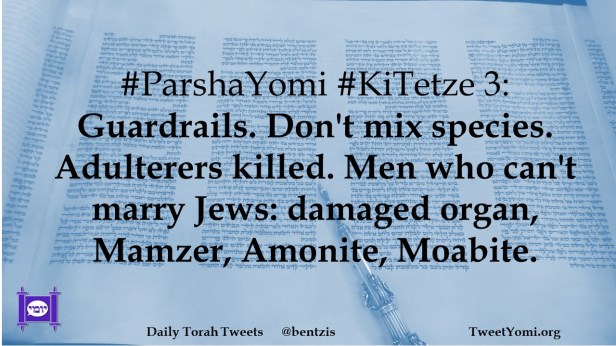 #ParshaYomi #KiTetze 3: Guardrails. Don’t mix species. Adulterers killed. Men who can’t marry Jews: damaged organ, Mamzer, Amonite, Moabite.