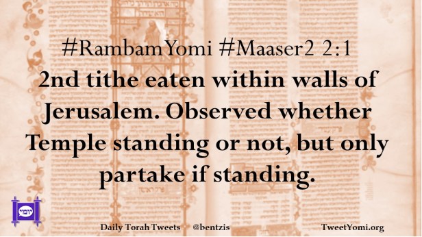 #RambamYomi #Maaser2 2:1 2nd tithe eaten within walls of Jerusalem. Observed whether Temple standing or not, but only partake if standing.