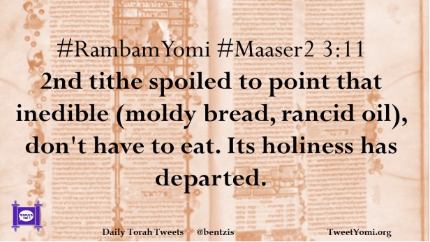 #RambamYomi #Maaser2 3:11 2nd tithe spoiled to point that inedible (moldy bread, rancid oil), don’t have to eat. Its holiness has departed.