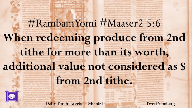 #RambamYomi #Maaser2 5:6 When redeeming produce from 2nd tithe for more than its worth, additional value not considered as $ from 2nd tithe.