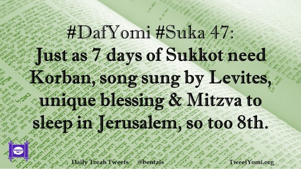 DafYomi, Suka #DafYomi #Suka 47 Date: August 29, 2021Author: ysspitz #DafYomi #Suka 47: Just as 7 days of Sukkot need Korban, song sung by Levites, unique blessing & Mitzva to sleep in Jerusalem, so too 8th. Share this: Share on X (Opens in new window) X Share on Facebook (Opens in new window) Facebook Like Loading... Related