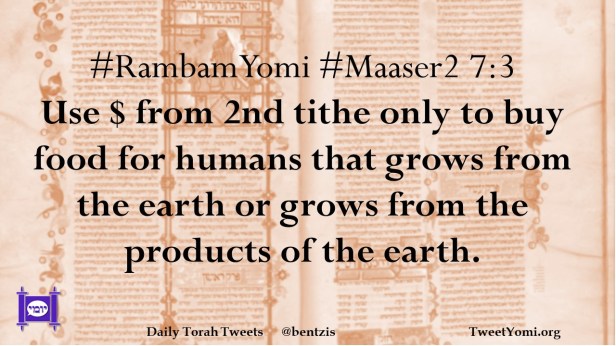 #RambamYomi #Maaser2 7:3 Use $ from 2nd tithe only to buy food for humans that grows from the earth or grows from the products of the earth.