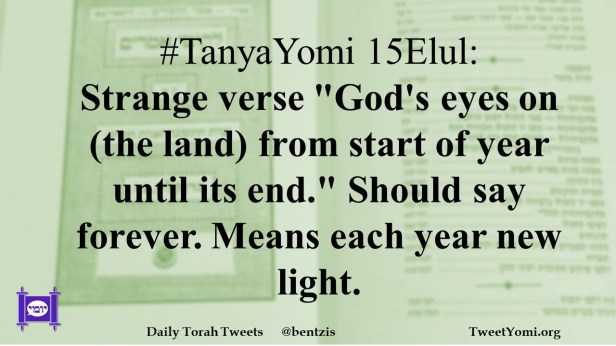 #TanyaYomi 15Elul: Strange verse “God’s eyes on (the land) from start of year until its end.” Should say forever. Means each year new light.