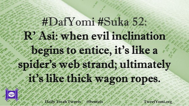 DafYomi, Suka #DafYomi #Suka 52 Date: August 30, 2021Author: ysspitz #DafYomi #Suka 52: R’ Asi: when evil inclination begins to entice, it’s like a spider’s web strand; ultimately it’s like thick wagon ropes. Share this: Share on X (Opens in new window) X Share on Facebook (Opens in new window) Facebook Like Loading... Related