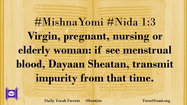 #MishnaYomi #Nida 1:3 Virgin, pregnant, nursing or elderly woman: if see menstrual blood, Dayaan Sheatan, transmit impurity from that time.