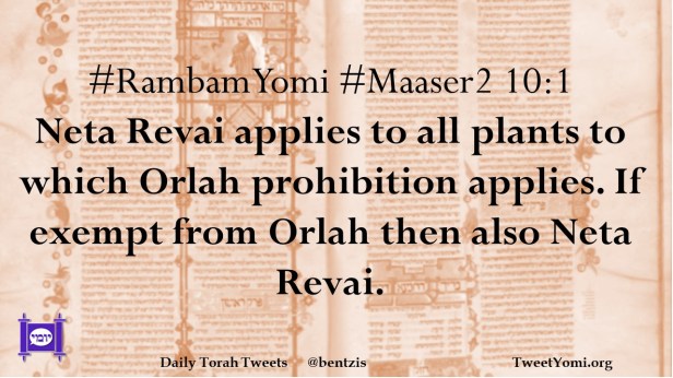 #RambamYomi #Maaser2 10:1 Neta Revai applies to all plants to which Orlah prohibition applies. If exempt from Orlah then also Neta Revai.