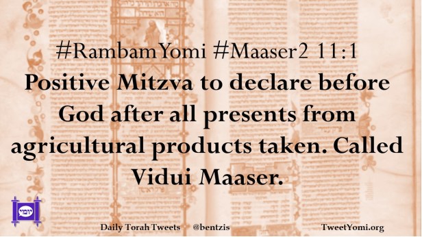 #RambamYomi #Maaser2 11:1 Positive Mitzva to declare before God after all presents from agricultural products taken. Called Vidui Maaser.