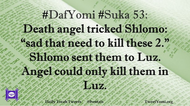 DafYomi, Suka #DafYomi #Suka 53 Date: August 31, 2021Author: ysspitz #DafYomi #Suka 53: Death angel tricked Shlomo: “sad that need to kill these 2.” Shlomo sent them to Luz. Angel could only kill them in Luz. Share this: Share on X (Opens in new window) X Share on Facebook (Opens in new window) Facebook Like Loading... Related