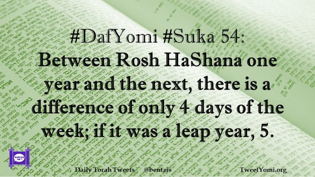 DafYomi, Suka #DafYomi #Suka 54 Date: August 31, 2021Author: ysspitz #DafYomi #Suka 54: Between Rosh HaShana one year and the next, there is a difference of only 4 days of the week; if it was a leap year, 5. Share this: Share on X (Opens in new window) X Share on Facebook (Opens in new window) Facebook Like Loading... Related