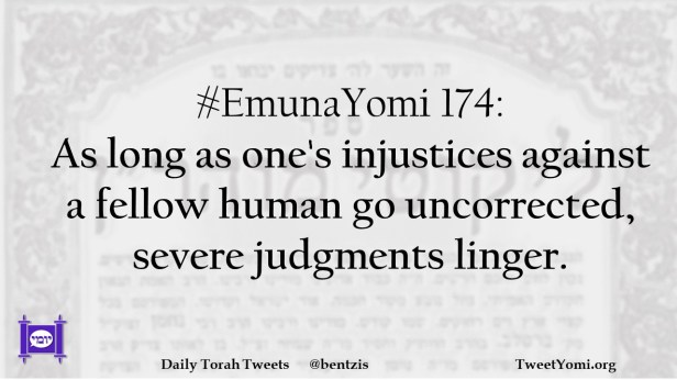 EmunaYomi #EmunaYomi 174 Date: August 31, 2021Author: ysspitz #EmunaYomi 174: As long as one’s injustices against a fellow human go uncorrected, severe judgments linger. Share this: Share on X (Opens in new window) X Share on Facebook (Opens in new window) Facebook Like Loading... Related