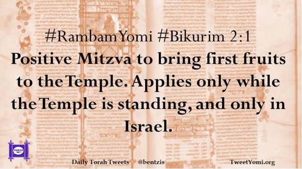 #RambamYomi #Bikurim 2:1 Positive Mitzva to bring first fruits to the Temple. Applies only while the Temple is standing, and only in Israel.