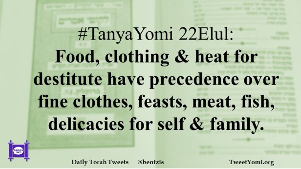 #TanyaYomi 22Elul: Food, clothing & heat for destitute have precedence over fine clothes, feasts, meat, fish, delicacies for self & family.