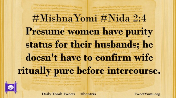 #MishnaYomi #Nida 2:4 Presume women have purity status for their husbands; he doesn’t have to confirm wife ritually pure before intercourse.