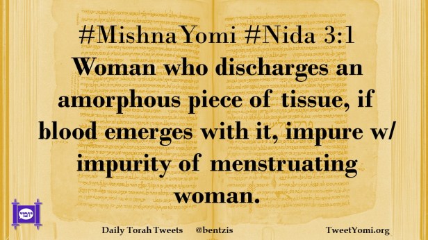 #MishnaYomi #Nida 3:1 Woman who discharges an amorphous piece of tissue, if blood emerges with it, impure w/ impurity of menstruating woman.