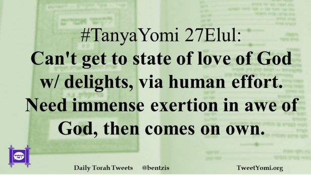#TanyaYomi 27Elul: Can’t get to state of love of God w/ delights, via human effort. Need immense exertion in awe of God, then comes on own.