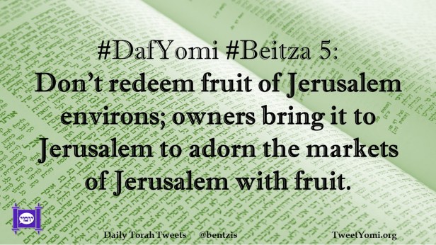 Beitza, DafYomi #DafYomi #Beitza 5 Date: September 5, 2021Author: ysspitz #DafYomi #Beitza 5: Don’t redeem fruit of Jerusalem environs; owners bring it to Jerusalem to adorn the markets of Jerusalem with fruit. Share this: Share on X (Opens in new window) X Share on Facebook (Opens in new window) Facebook Like Loading... Related