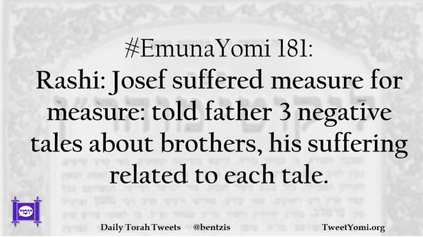 #EmunaYomi 181: Rashi: Josef suffered measure for measure: told father 3 negative tales about brothers, his suffering related to each tale.
