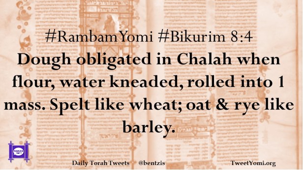 #RambamYomi #Bikurim 8:4 Dough obligated in Chalah when flour, water kneaded, rolled into 1 mass. Spelt like wheat; oat & rye like barley.