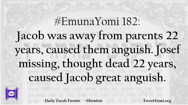 #EmunaYomi 182: Jacob was away from parents 22 years, caused them anguish. Josef missing, thought dead 22 years, caused Jacob great anguish.