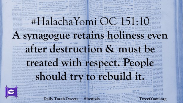 #HalachaYomi OC 151:10 A synagogue retains holiness even after destruction & must be treated with respect. People should try to rebuild it.