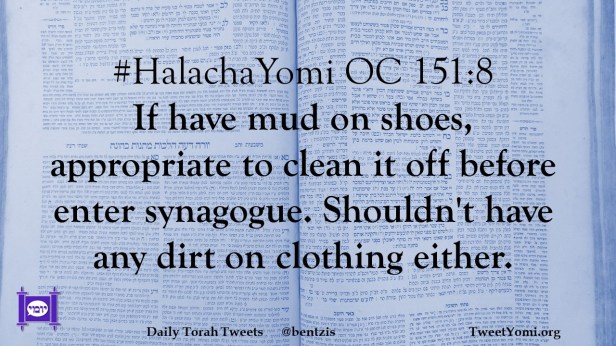 #HalachaYomi OC 151:8 If have mud on shoes, appropriate to clean it off before enter synagogue. Shouldn’t have any dirt on clothing either.