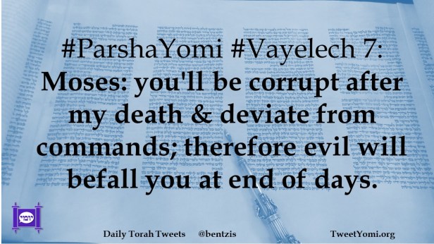 #ParshaYomi #Vayelech 7: Moses: you’ll be corrupt after my death & deviate from commands; therefore evil will befall you at end of days.