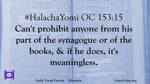 HalachaYomi #HalachaYomi OC 153:15 Date: September 14, 2021Author: ysspitz #HalachaYomi OC 153:15 Can’t prohibit anyone from his part of the synagogue or of the books, & if he does, it’s meaningless. Share this: Share on X (Opens in new window) X Share on Facebook (Opens in new window) Facebook Like Loading... Related