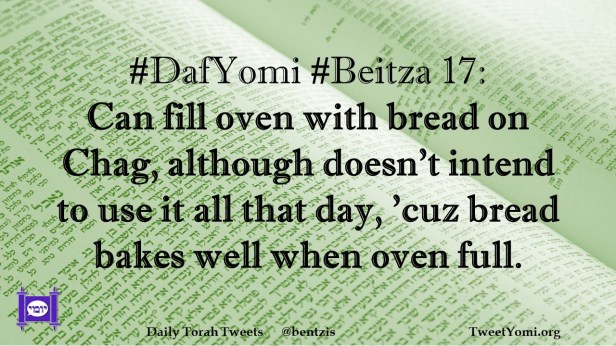 Beitza, DafYomi #DafYomi #Beitza 17 Date: September 17, 2021Author: ysspitz #DafYomi #Beitza 17: Can fill oven with bread on Chag, although doesn’t intend to use it all that day, ‘cuz bread bakes well when oven full. Share this: Share on X (Opens in new window) X Share on Facebook (Opens in new window) Facebook Like Loading... Related