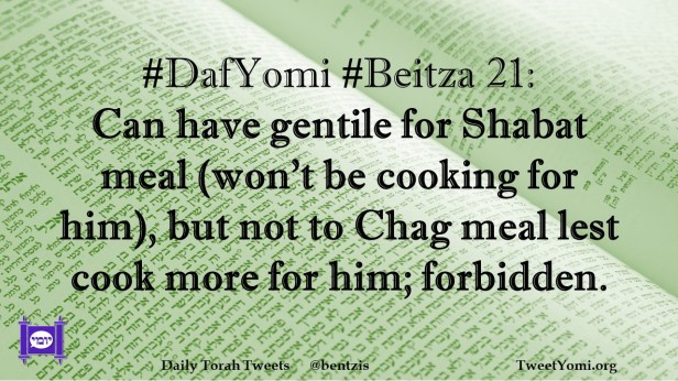 Beitza, DafYomi #DafYomi #Beitza 21 Date: September 20, 2021Author: ysspitz #DafYomi #Beitza 21: Can have gentile for Shabat meal (won’t be cooking for him), but not to Chag meal lest cook more for him; forbidden. Share this: Share on X (Opens in new window) X Share on Facebook (Opens in new window) Facebook Like Loading... Related