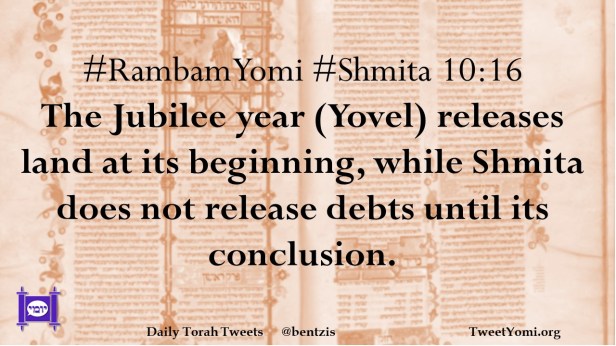 #RambamYomi #Shmita 10:16 The Jubilee year (Yovel) releases land at its beginning, while Shmita does not release debts until its conclusion.
