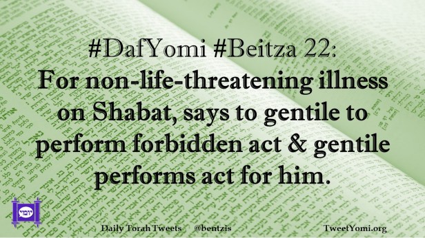 Beitza, DafYomi #DafYomi #Beitza 22 Date: September 22, 2021Author: ysspitz #DafYomi #Beitza 22: For non-life-threatening illness on Shabat, says to gentile to perform forbidden act & gentile performs act for him. Share this: Share on X (Opens in new window) X Share on Facebook (Opens in new window) Facebook Like Loading... Related
