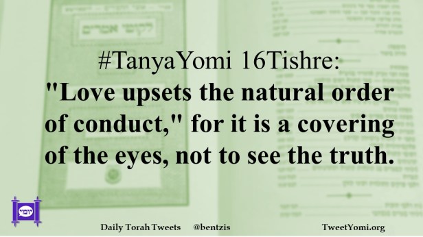 TanyaYomi #TanyaYomi 16Tishre Date: September 22, 2021Author: ysspitz #TanyaYomi 16Tishre: “Love upsets the natural order of conduct,” for it is a covering of the eyes, not to see the truth. Share this: Share on X (Opens in new window) X Share on Facebook (Opens in new window) Facebook Like Loading... Related