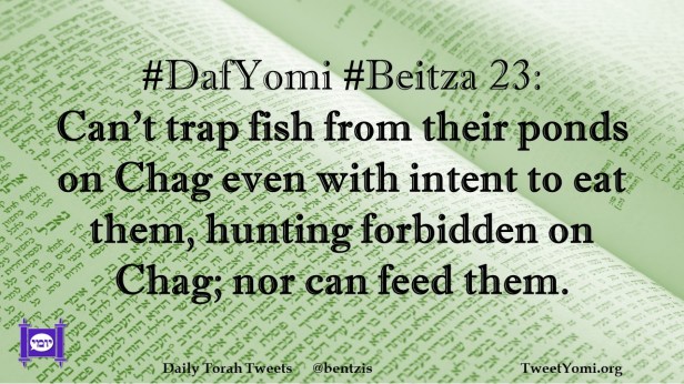 Beitza, DafYomi #DafYomi #Beitza 23 Date: September 23, 2021Author: ysspitz #DafYomi #Beitza 23: Can’t trap fish from their ponds on Chag even with intent to eat them, hunting forbidden on Chag; nor can feed them. Share this: Share on X (Opens in new window) X Share on Facebook (Opens in new window) Facebook Like Loading... Related