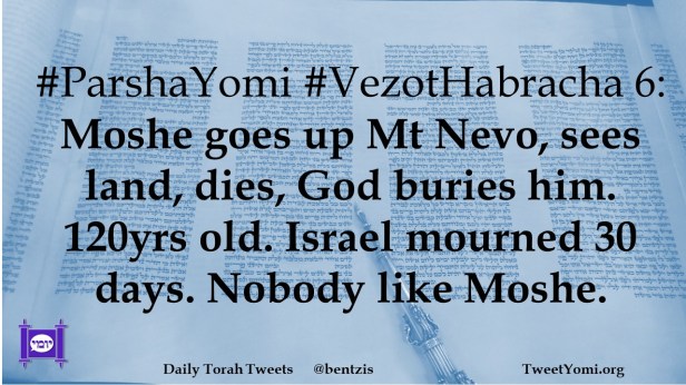 #ParshaYomi #VezotHabracha 6: Moshe goes up Mt Nevo, sees land, dies, God buries him. 120yrs old. Israel mourned 30 days. Nobody like Moshe.