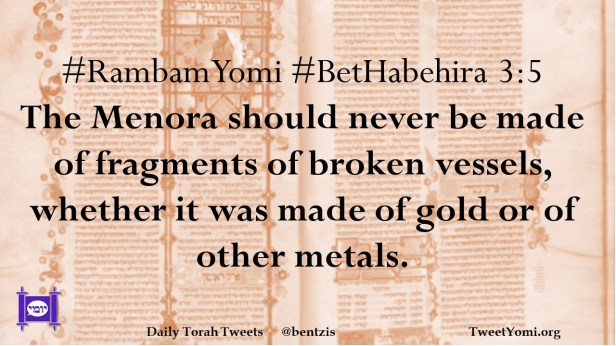 #RambamYomi #BetHabehira 3:5 The Menora should never be made of fragments of broken vessels, whether it was made of gold or of other metals.