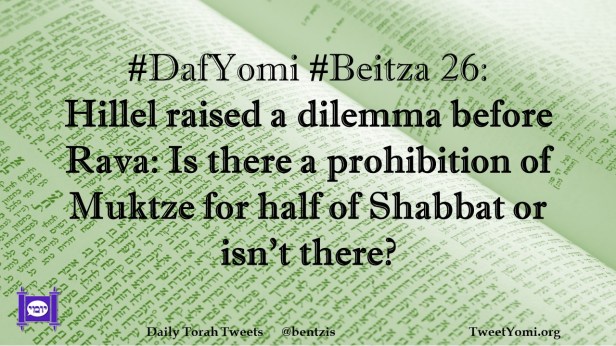 Beitza, DafYomi #DafYomi #Beitza 26 Date: September 26, 2021Author: ysspitz #DafYomi #Beitza 26: Hillel raised a dilemma before Rava: Is there a prohibition of Muktze for half of Shabbat or isn’t there? Share this: Share on X (Opens in new window) X Share on Facebook (Opens in new window) Facebook Like Loading... Related