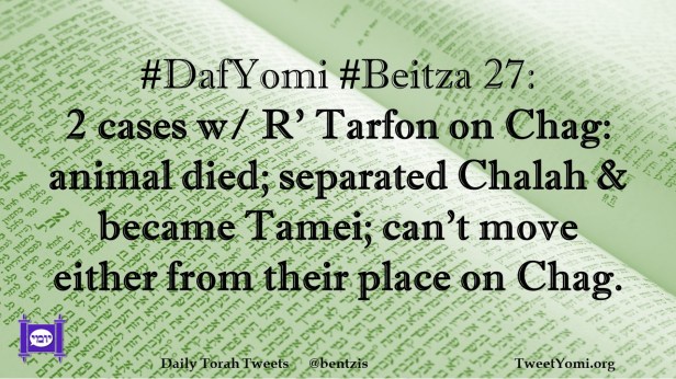 Beitza, DafYomi #DafYomi #Beitza 27 Date: September 28, 2021Author: ysspitz #DafYomi #Beitza 27: 2 cases w/ R’ Tarfon on Chag: animal died; separated Chalah & became Tamei; can’t move either from their place on Chag. Share this: Share on X (Opens in new window) X Share on Facebook (Opens in new window) Facebook Like Loading... Related