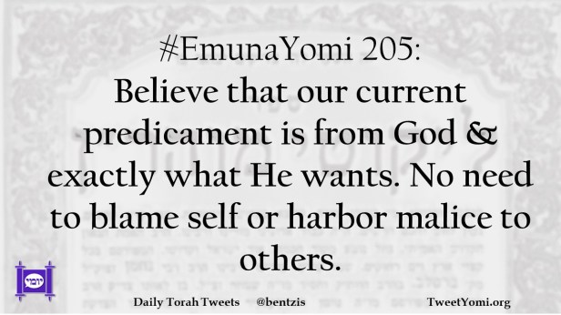#EmunaYomi 205: Believe that our current predicament is from God & exactly what He wants. No need to blame self or harbor malice to others.